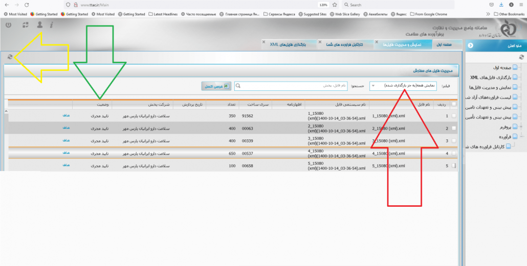 بعد از پردازش اطلاعات فایل های XML توسط سایت تیتک، در صورت صحت اطلاعات همانند تصویر زیر که با فلش سبز رنگ مشخص شده است ، وضعیت فایل ها به حالت فایل تایید شده تغییر حالت می دهد.