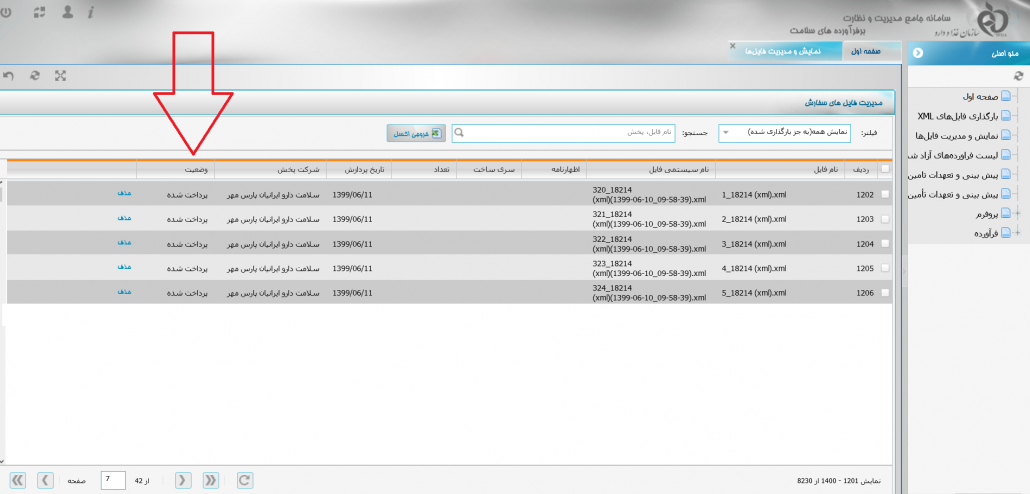 جهت مشاهده وضعیت فایل های XML بارگذاری شده شما می توانید پس از بستن پنجره تایید فایل که در تصویر بالا مشاهده می شود، از قسمت فیلتر، گزینه نمایش همه ( به جزء بارگذاری شده ها) را انتخاب نمایید ( در تصویر زیر با فلش قرمز رنگ نمایش داده شده است).